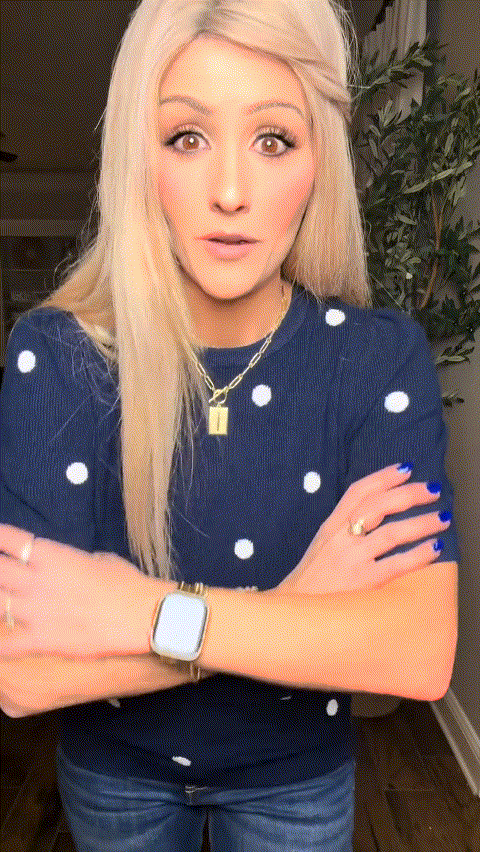 This is a knitted polka dot top that can be worn all year round. It is Incredibly Soft, flattering, and such a rich cookie. The white polka dots are adorable too! They hit right at that perfect spot, not too short, not too long - which makes this sweater ideal for layering or wearing on its own.